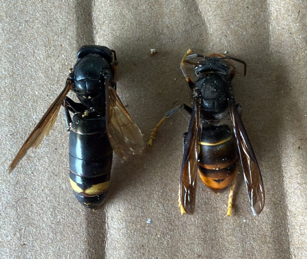 Ondanks de inmiddels lagere temperaturen en de donkere dagen zijn de AH’s zich flink aan het verspreiden! Kijk om je heen en meld je waarneming om daarna de nesten te vinden en deze te (laten) vernietigen! Links een Koningin van de Aziatische Hoornaar en rechts een werkster!