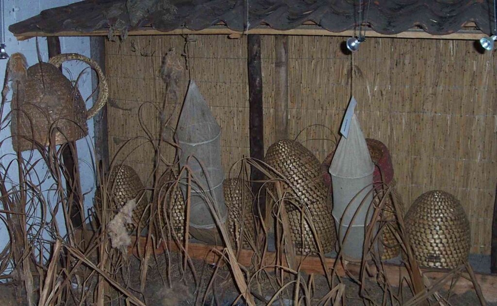 Op de onderste foto’s enkele opstellingen van een aantal bijenstal met korven waarbij de zwermfuik is opgesteld.