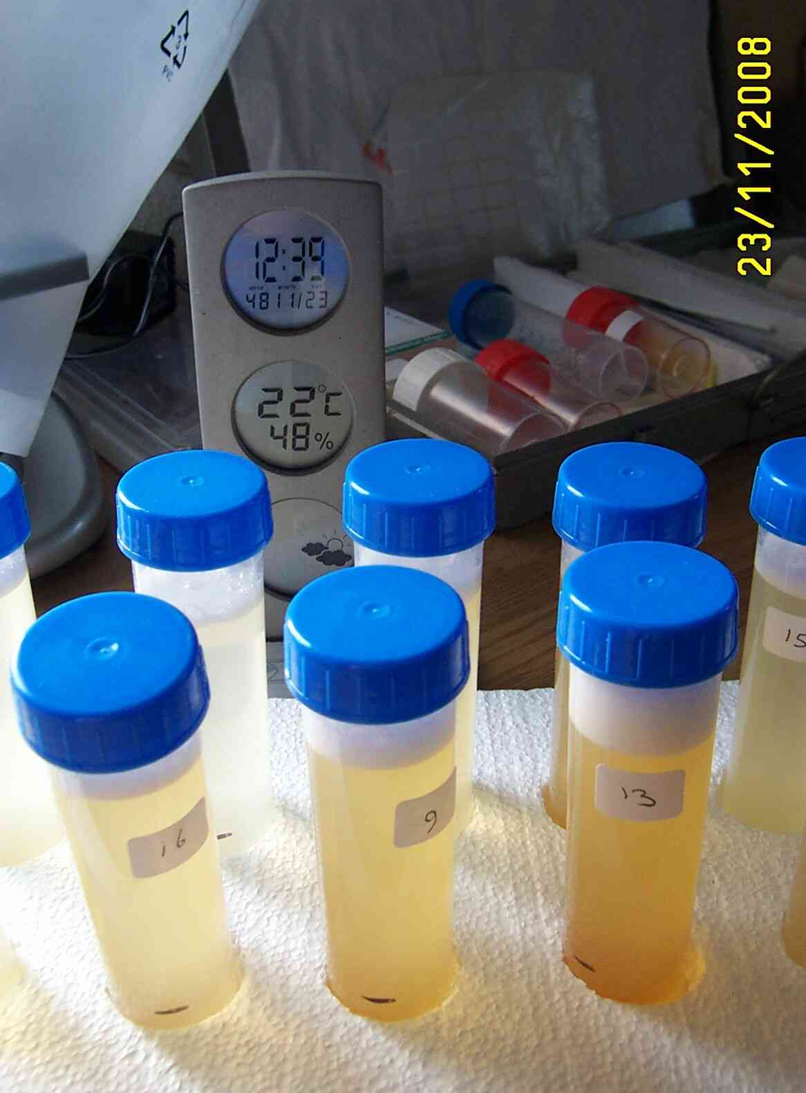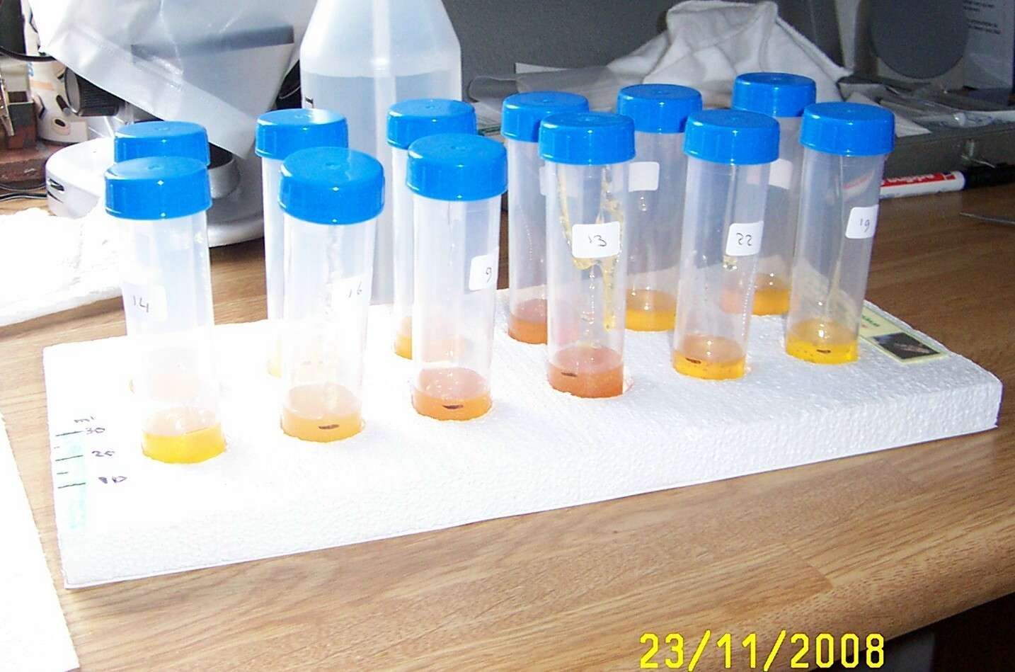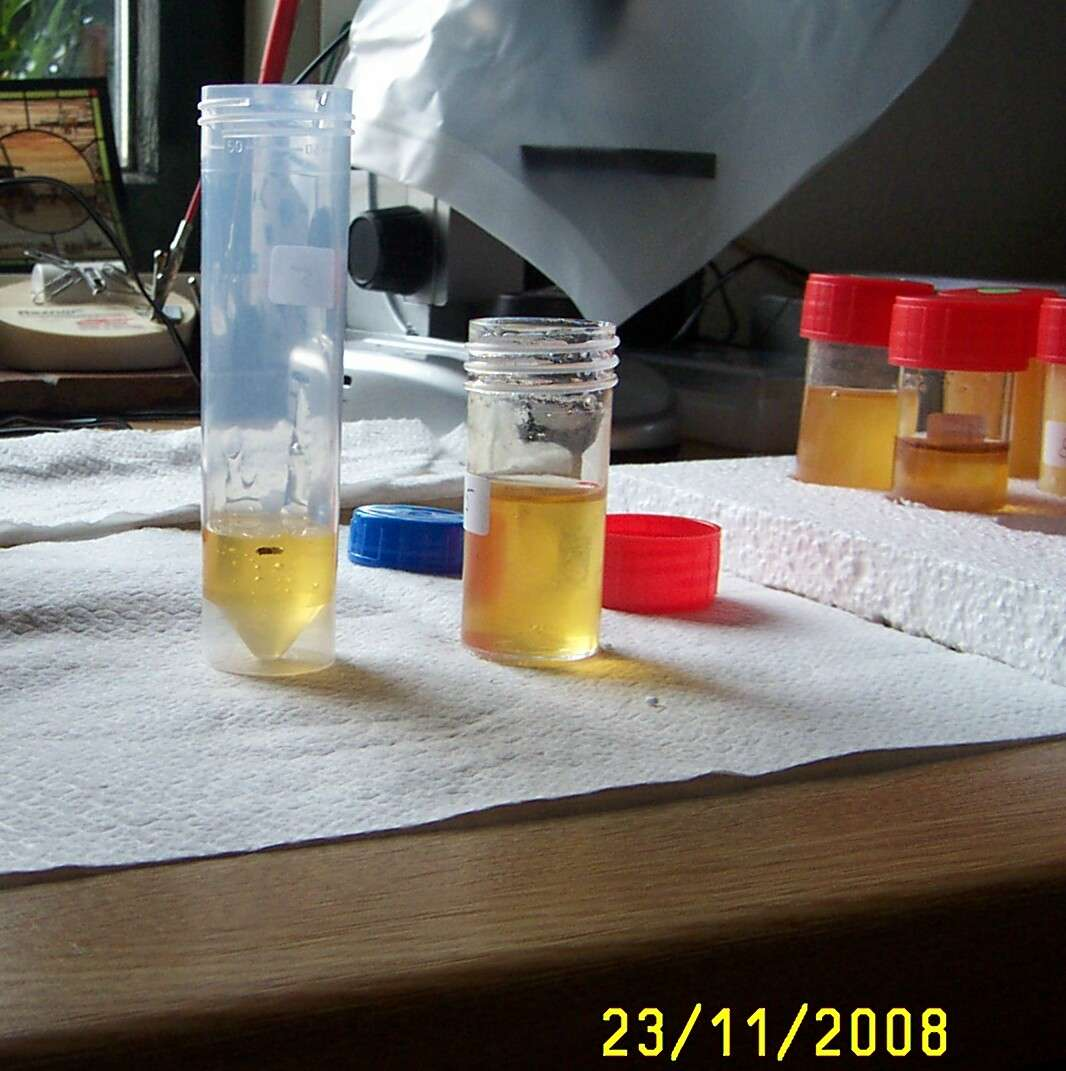 De eerste handelingen:![]() Om pollen van honingmonsters te bekijken hebben we buiten een microscoop ook een preparaat nodig waar de pollen op zijn aangebracht. Om deze pollen zichtbaar te maken gaan we als volgt te werk; We nemen 10 gram van de te onderzoeken honing, dat komt overeen met ca. 7,5ml.(afhankelijk van vochtgehalte en S.M. Dat is van honing tussen de 1,3 en 1,4) De honing wordt in een sediments-, Greiner- of bezinkbuisje gedaan en voegen daar 40 ml demiwater aan toe, en laten dat 24 uur staan. Hierna wordt dit afgegoten en wordt wederom met 40ml demiwater bijgevuld. Na schudden blijft ook dit minimaal 12 uur staan. Hierbij zullen de pollen worden afgescheiden en verzamelen zich onder in de buis. Na het wederom afgieten blijft een klein deel achter, het sediment wordt dan met een pipetbuisje op het objectglaasje aangebracht. Na droging worden twee kleuren -warme (ca 40°C)-glycerine toegevoegd. Rood rechts en kleurloos links. Beide worden afgedekt met een objectglaasje. Het glaasje direct voorzien van codering of etiket. ![]() Om preparaatglaasjes langer “houdbaar” te houden kan dat worden afgelakt met o.a. blanke nagellak. Rondom het objectglaasje een laagje lak aanbrengen. | De werkzaamheden in beeld gebracht!![]() De bezinkbuisjes worden gevuld met 10 gram honing ![]() Monsterpotje en Greinerbuisje ![]() Grienerbuisje gevuld met 10 gram honing ![]() Buisjes worden met demiwater gevuld ![]() Spuitflesje voor het vullen van de buisjes ![]() De bezink- of Greinerbuisjes zijn gevuld nu schudden tot alle kristallen zijn opgelost ![]() De buisjes zijn na het afgieten voor de tweede maal gevuld ![]() De objectglaasjes liggen gereed om het sediment er op aan te brengen. Codering vooraf aanbrengen met de gegevens betrekking hebbende op het te onderzoeken bemonstering. ![]() Sediment wordt op de objectglaasjes aangebracht |
