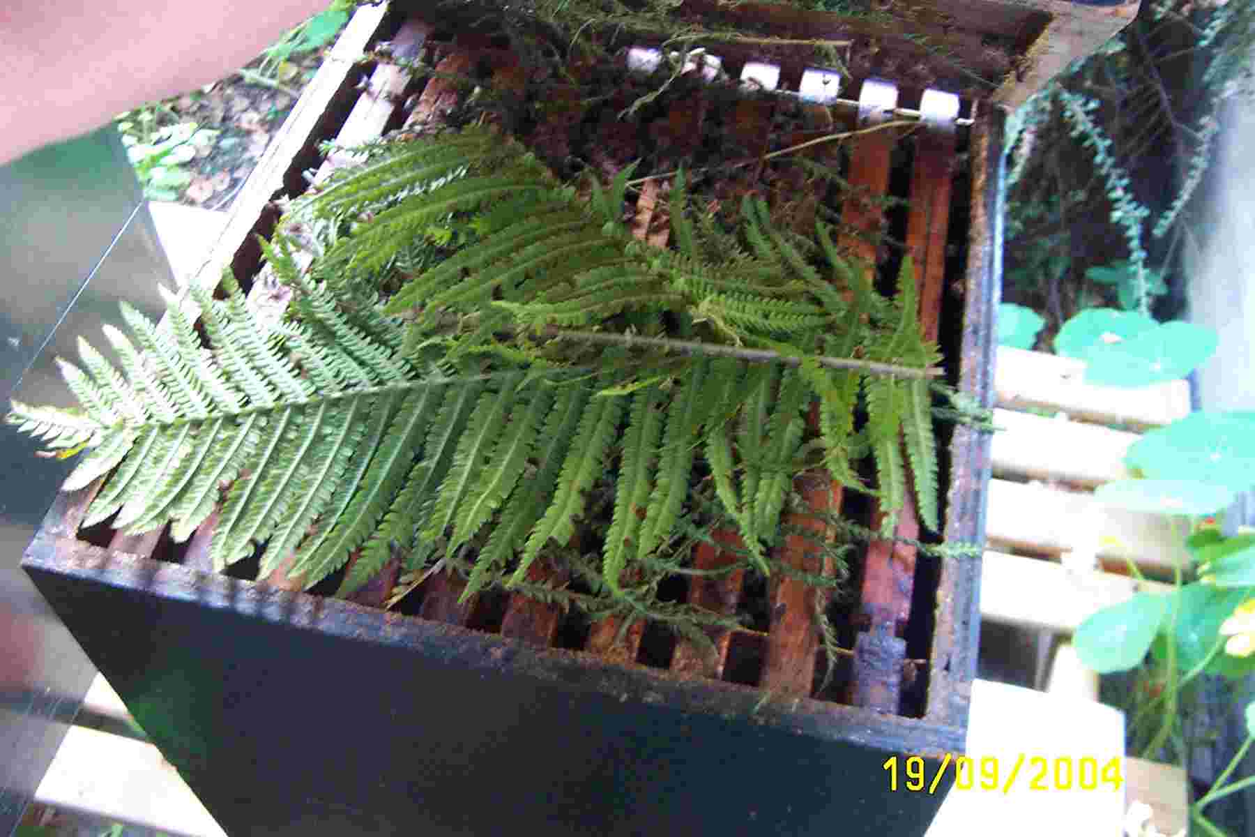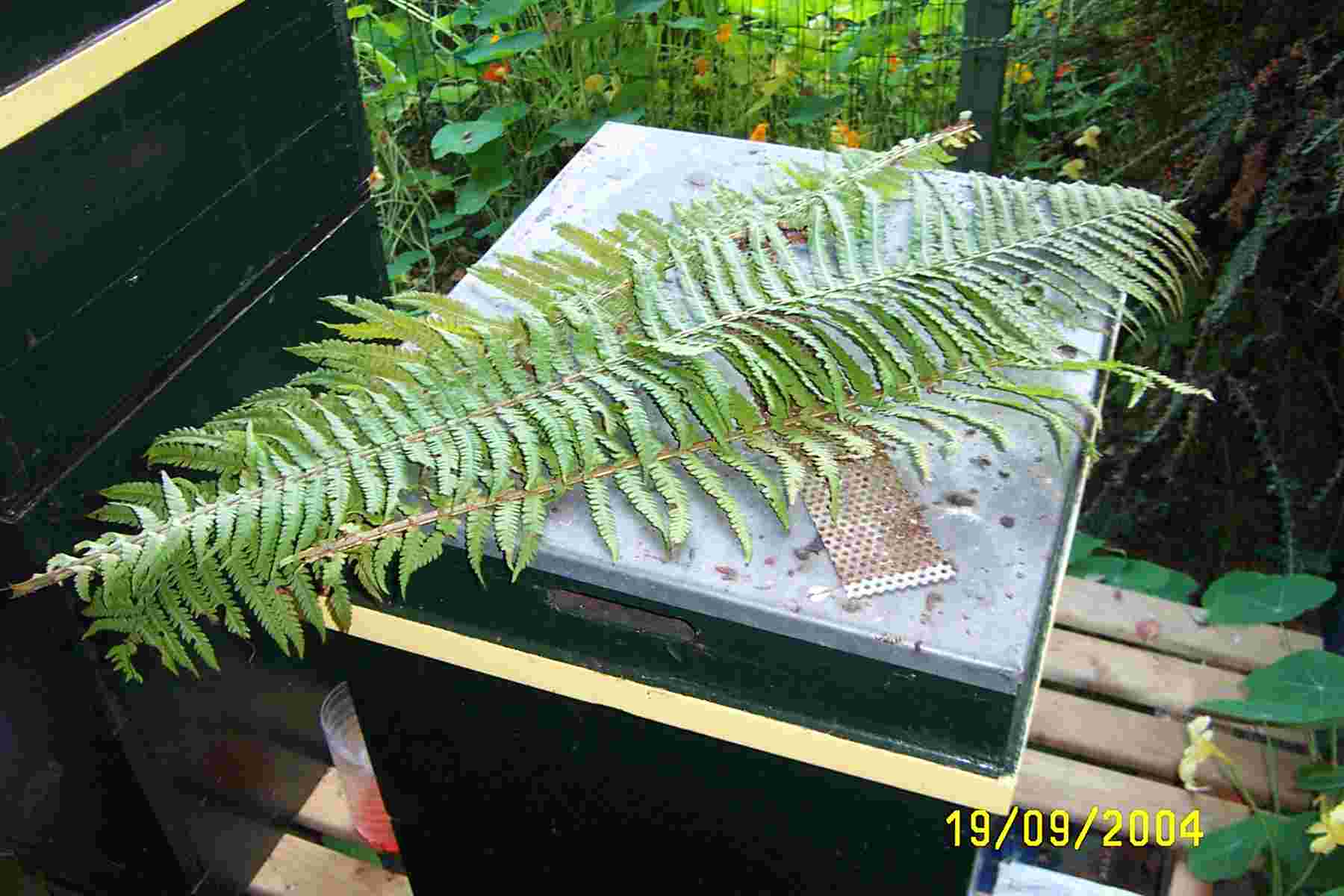 Door mij enkele keren toegepast waarbij zeeer veel mijten gedood werden, die op de bodemplaat van de gaasbodem lagen, tot zelf zeer jonge nog witte mijten!! Werden deze uit de raten gehaald door de bijen?? De moeite van het onderzoeken waard, maar daar ben ik "te klein" voor! Varens werden bovenop de raat gelegd en werden door de bijen "afgekloven", alleen de nerf bleef over. Na een week nieuwe er in gelegd. |